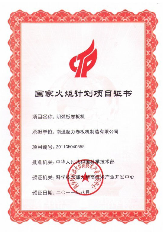 今年2月,南通超力卷板機(jī)制造有限公司正式接受到國家科技部頒發(fā)的“陰弧板卷板機(jī)”火炬計劃項目證書。至此,該火炬計劃項目正式立項。